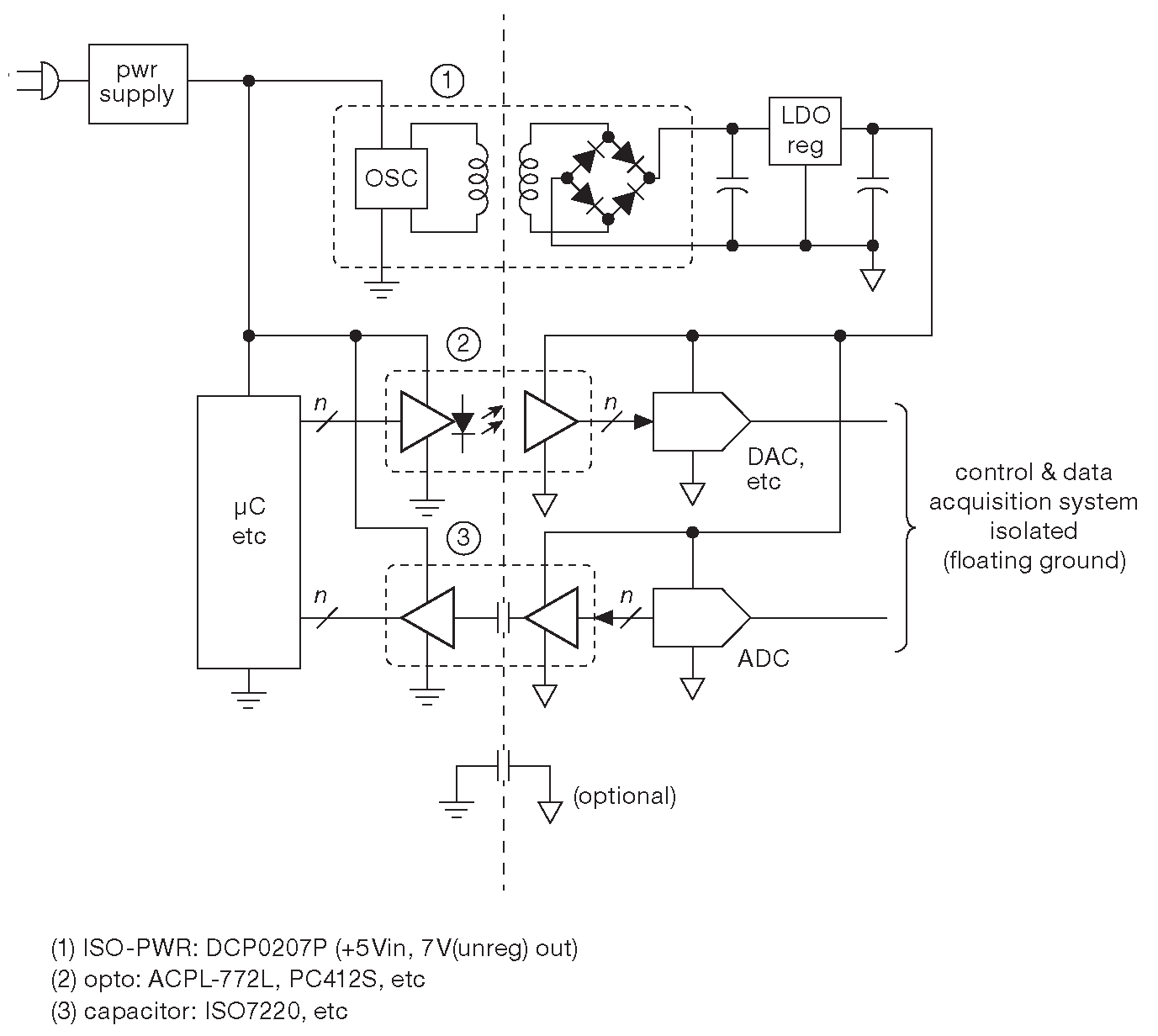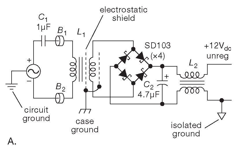 Предположим, что требуется проводить чувствительные измерения слабых аналоговых сигналов с помощью многоразрядного АЦП и передавать результаты на микроконтроллер, или, возможно, в обратной задаче требуется с помощью ЦАПа получить постоянное напряжение с низким шумом и стабильностью на уровне микровольт. Такого рода устройства создают изрядную проблему, и, чтобы отделить малосигнальную аналоговую часть от шумного микроконтроллера и его земли, полезно использовать схемы гальванической развязки сигналов, например, оптоизоляторы ( §12.7 ). Кроме того, требуется изолированный источник постоянного тока, потому что часто требуется, чтобы вся аналоговая часть, включая «аналоговую землю», плавала относительно цифровой, причём разница потенциалов между разными частями устройства может быть очень заметной - сотни вольт.