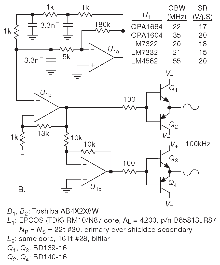Рис. X9.55 Подавление шума преобразователя с синусоидальной формой сигнала и экранированным трансформатором. (A) Схема. (B) Буферированный квадратурный генератор. На рис. X9.59 приводятся альтернативные варианты с треугольным и трапециевидным сигналом, а на рис. X9.61 - тактируемый генератор прямоугольных сигналов. На рис. X9.60 показано, как выглядит сердечник