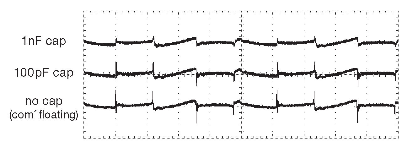 Рис. X9.56 Шумовая наводка в шине земли от преобразователя с экранированным трансформатором по схеме X9.55 . Измерения проводились на 50-омном резисторе, соединяющем входную и выходную земли при 12 Vdc на выходе и нагрузке 25 mA . Лучи показывают картину для трёх номиналов фильтрующего конденсатора. Обратите внимание на сильное изменение ( от 50× до 200× ) вертикальной шкалы по сравнению с рис. X9.52 и X9.53 . По горизонтали 2 μs/div , по вертикали 1 mV/div