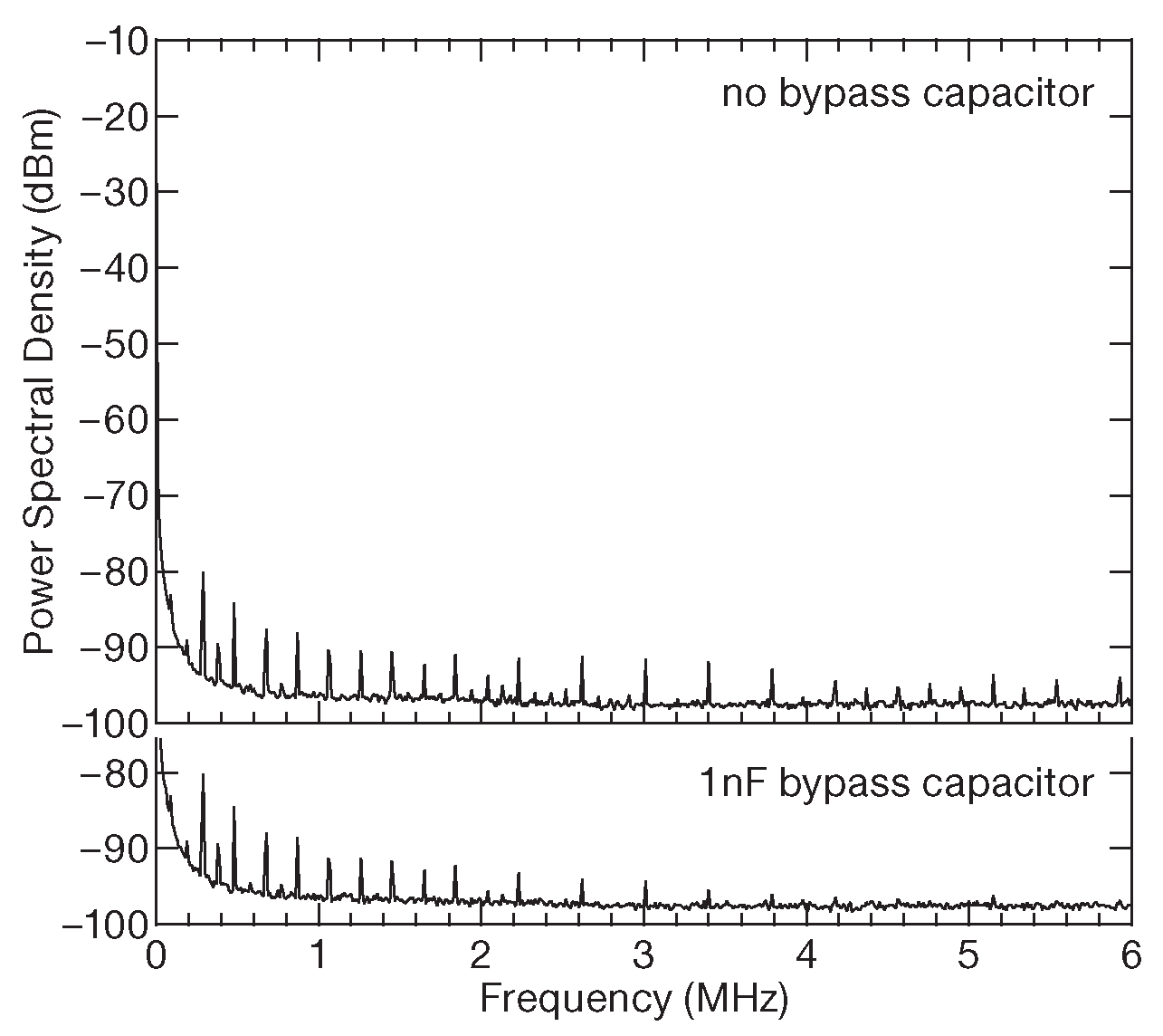Рис. X9.54 Спектр наводок двух преобразователей постоянного напряжения с рис. X9.52 и X9.53 , снятые при тех же условиях, что и нижние лучи на картинках