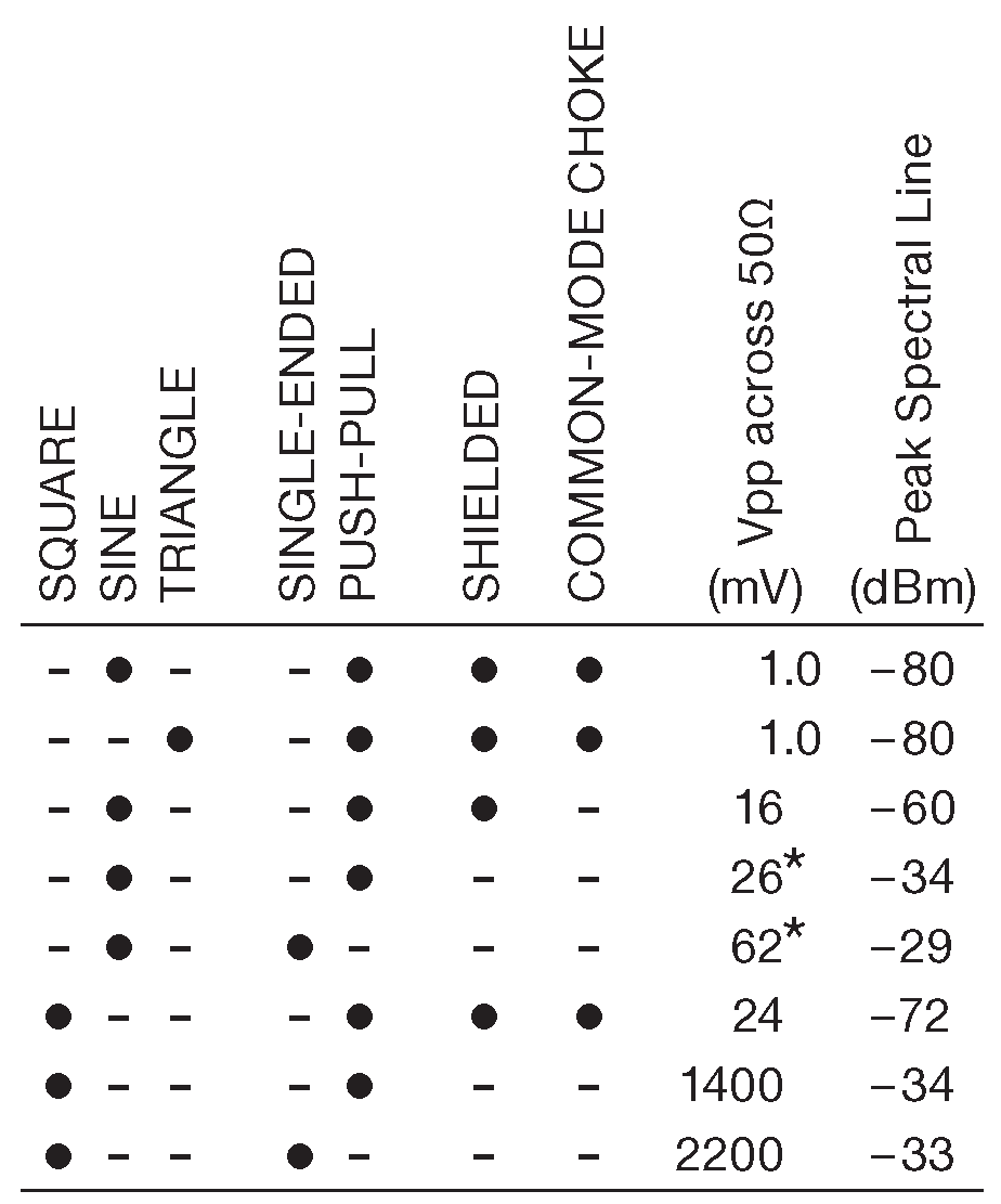 Для проверки эффективности каждого элемента фиксировалась амплитуда и спектр наводок для разных модификаций схемы. Данные приводятся в таблице на рис. X9.58 , и по ним ясно, что, если требуется максимальное подавление сигнала переключения, важен каждый элемент конструкции. Форма сигнала может быть и несинусоидальной, пока сигнал остаётся неразрывным [* работа с разрывным током разбирается в §9.8.2 ] . Хорошо работает треугольный сигнал и прямоугольник с ограниченной скоростью нарастания ( см. рис. X9.59 ). LT1533 фирмы Linear Technology использует именно синус, хотя в их технической литературе синфазный шум даже не упоминается, и всё внимание обращено на шумы переключения, т.е. дифференциальный или нормальный шум на выходе 38 .