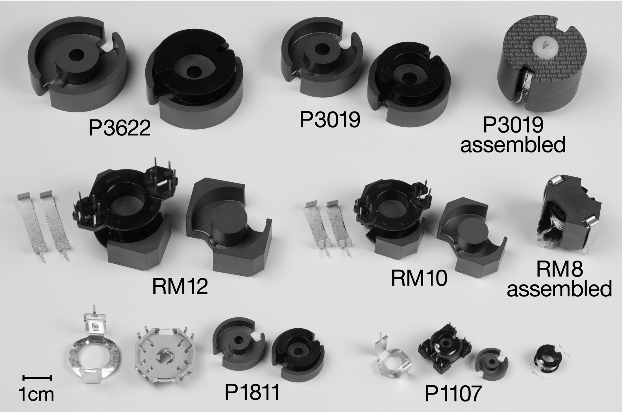Рис. X9.60 Несколько стилей и размеров ферритовых сердечников. Для «чашек» указывается внешний диаметр и высота, например, P3019 - ∅3 cm , высота в сборе 1.9 cm . Половины сердечников изображены вместе с каркасами для обмоток. В комплект также входят сборочные клипсы и иногда пластины с внешними выводами. Для \(L_1\) и \(L_2\) на схеме X9.55 использовался сердечник RM10