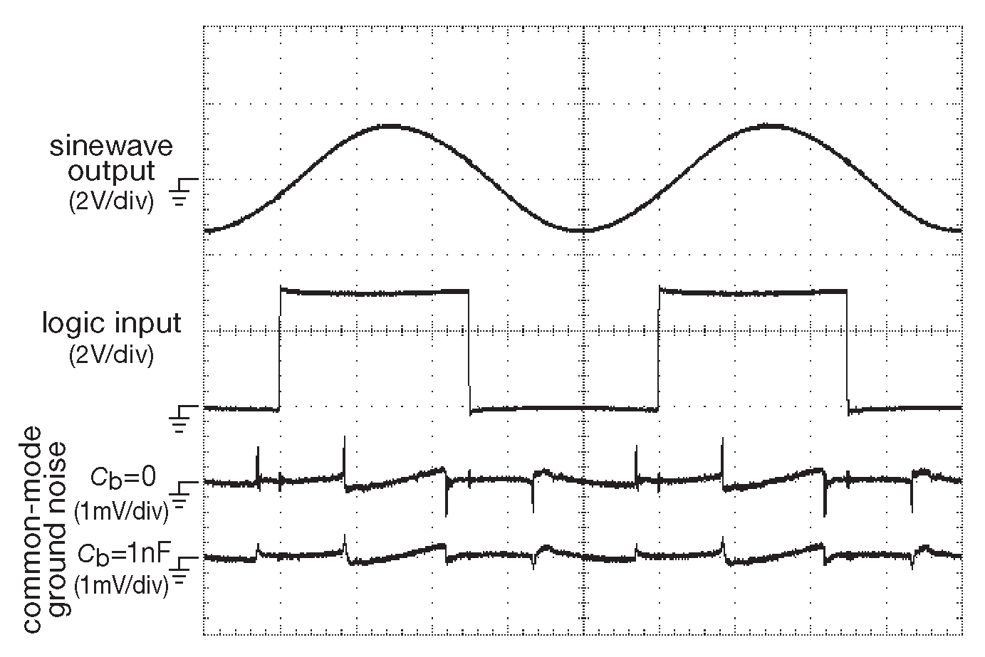 Рис. X9.62 Формы сигналов преобразователя с рис. X9.55 для синуса, полученного из меандра по схеме X9.61 . В качестве \(L_1\) использовалась индуктивность 1433507C 3.3 mH фирмы TDK и конденсаторе 820 pF . Столь же хорошо работает пара PE-50502NL фирмы Pulse Engineering и конденсатор 680 pF . По горизонтали 2 μs/div