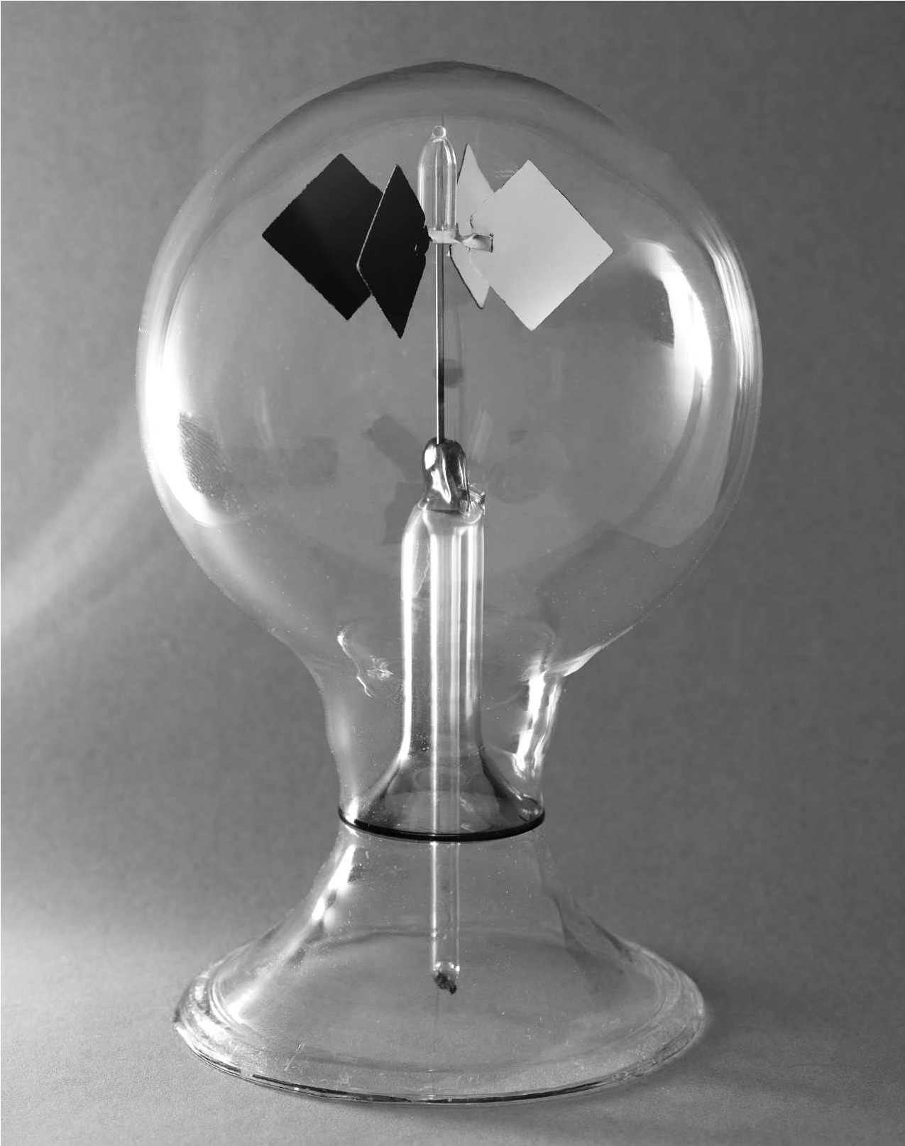 Рис. X9.92 Радиометр Крукса, изобретённый в 1873 году, запустил продолжавшуюся несколько десятилетий дискуссию о его «обратном» вращении. Эту штуку очень трудно фотографировать: света должно быть мало ( тогда крыльчатка неподвижна ), приходится дожидаться, пока она, наконец, перестанет качаться, выбрать правильное положение, и... Хуже всего то, что полированные стороны норовят показать уши фотографа. Пришлось потратить несколько бесплодных часов, прежде чем удалось сделать её портрет