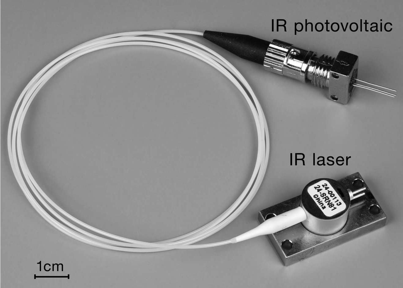 Авторы решили собрать и попробовать в работе систему оптического питания. Сначала пришлось отправиться на eBay, где был приобретён 66 2-ваттный лазер JDSU 2486-L3 с длиной волны 830 nm и около метра оптического волокна 62.5/125 μ/m с разъёмами ST на концах 67 . Там же был куплен квадратный 40-миллиметровый монокристаллический 68 фотогенераторный модуль ( 2V , активная площадь 25×35 mm , $17.60 за десяток - дешёвка! ). Выбор определялся ценой: она была в сотни раз ниже, чем предложения Broadcom. Выглядело приобретение непрезентабельно и громоздко. Приёмник был помещён на одном конце трубки ∅2.5"×6" , а на другом закреплён разъём ST оптического кабеля. Но результат получился обнадёживающий - 150 mA при 2V 69 .