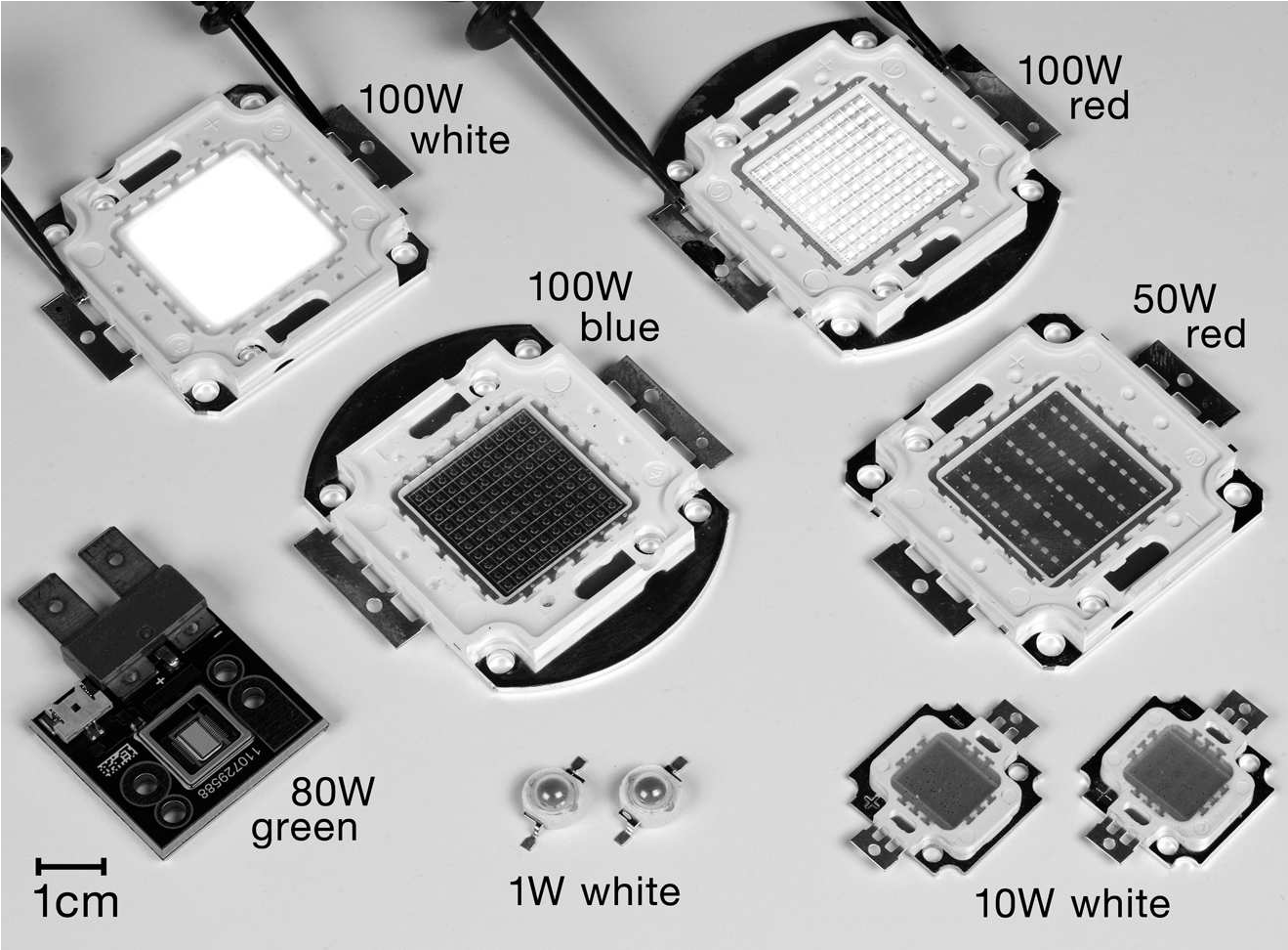Рис. X9.97 Светодиодные матрицы, выполненные по технологии «Кристалл-на-плате» ( COB ). Выпускаются многих цветов и в том числе белые ( жёлтый люминофор поверх синего светодиода ), недороги ( ∼$15 за 100 W ) и используются для освещения. Зелёная «фотонная матрица» - излучатель в левом нижнем углу - используется вместе с аналогичным согласованным синим и красным модулем в цифровых проекторах вместо галогенных ламп. Он выдаёт 2000 люмен с площади 0.12 cm2 . Включённые модули на фото работают при сильно сниженном токе: на полной мощности смотреть на них просто больно