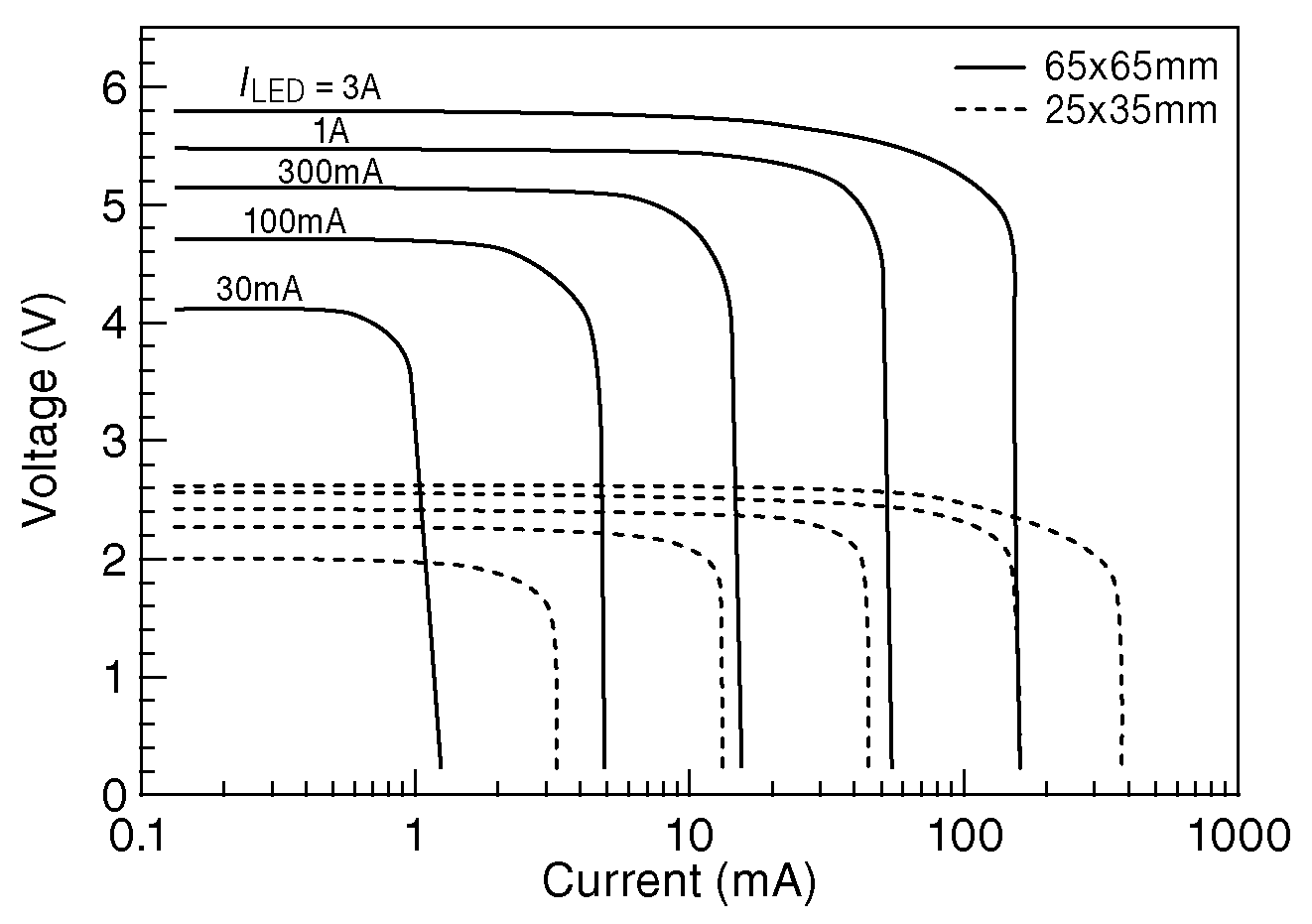 Рис. X9.94 Вольтамперная характеристика 6-вольтового фотогенераторного модуля Broadcom AFBR-POCx06L по справочным данным