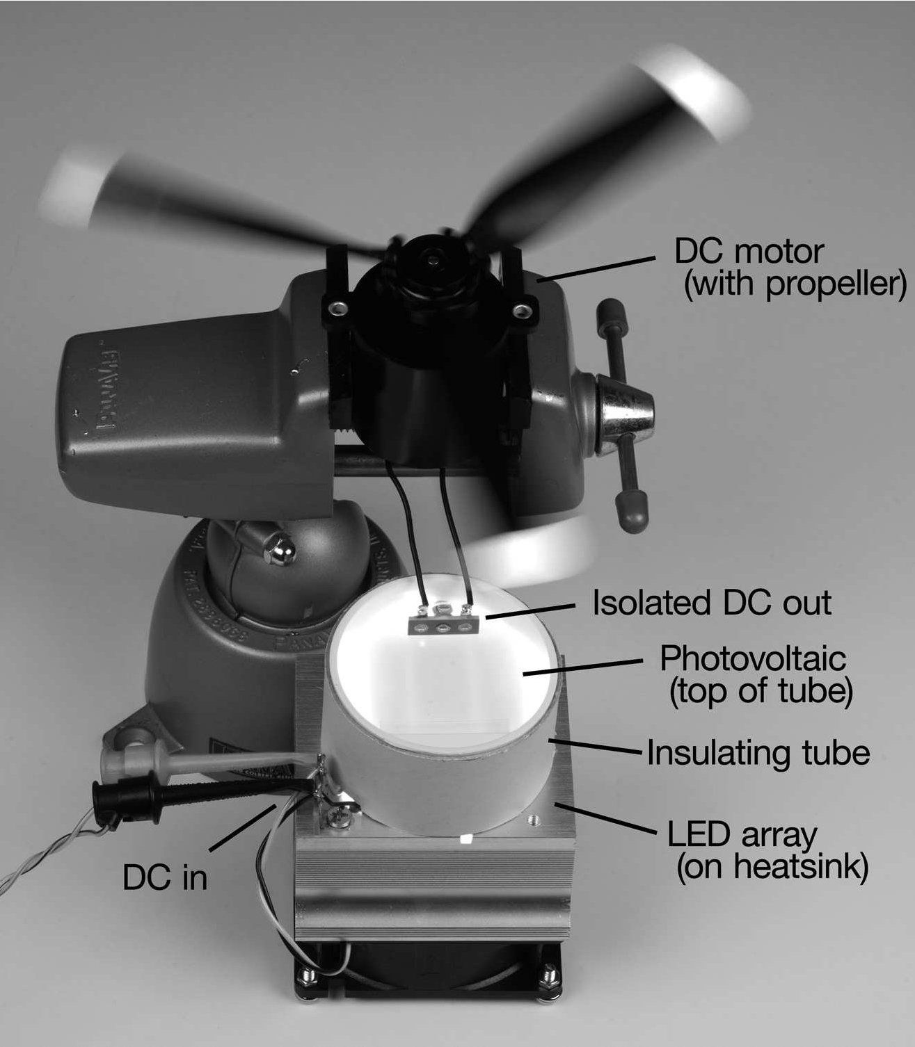 Рис. X9.99 Игрушечное фотоактивное устройство. Матрица красных светодиодом работает на кремниевый фотогенераторный модуль. От последнего запитан электромотор, вращающий 3-лопастную крыльчатку